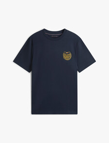 This stretch-cotton crewneck T-shirt features a striking golden logo patch for a bold, fresh statement.