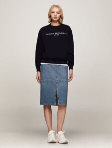 Channel the retro spirit with this soft yet sturdy denim skirt made from regenerative cotton. The high-waisted, fitted silhouette features a paneled design and a front slit. A metallic flag applique on the side adds a subtle branded touch.