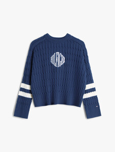 This cable knit jumper in pure combed cotton features bold script logo embroidery on the front for a signature finish.