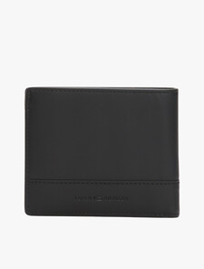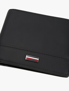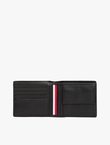 這款時尚皮革雙折短夾可妥善收納卡片和現金,正面飾有細長的琺瑯旗幟。