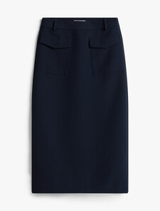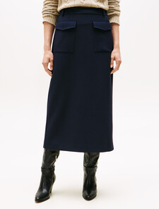 這款輕盈的中長裙裝配有後背開衩和簡潔的翻蓋口袋,彰顯考究的剪裁美學。