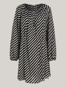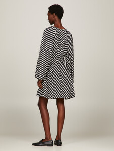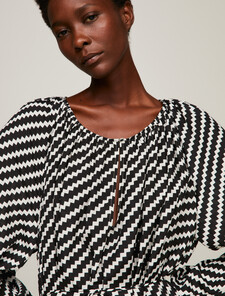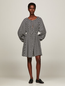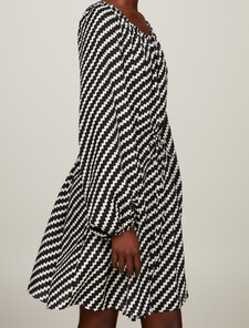 這款鋸齒狀條紋印花及膝洋裝採用寬鬆版型的設計,配有燈籠袖,可立即為派對做好準備。