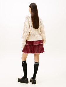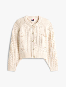 這款富含羊毛的開襟外套結合粗絞花針織設計和珍珠鈕扣,饒富可愛活潑的氣息,既可作為開襟外套也可作為舒適的毛衣。